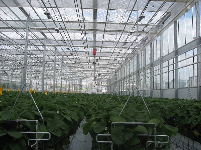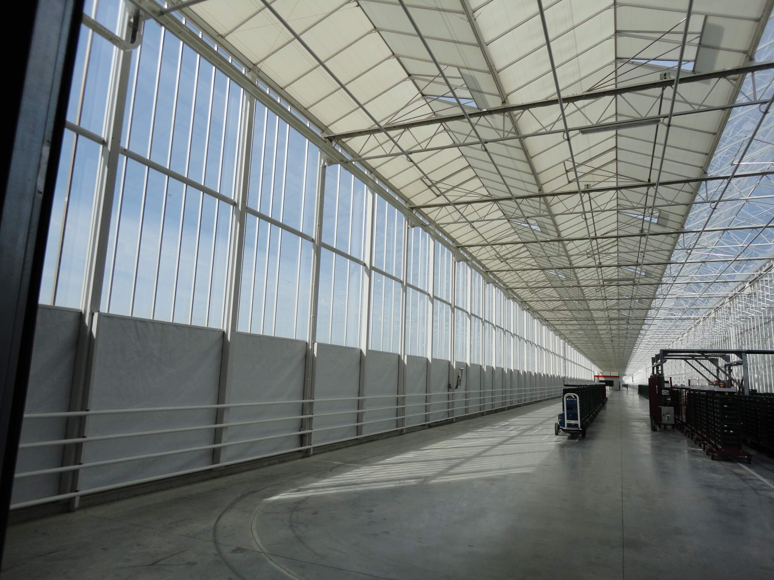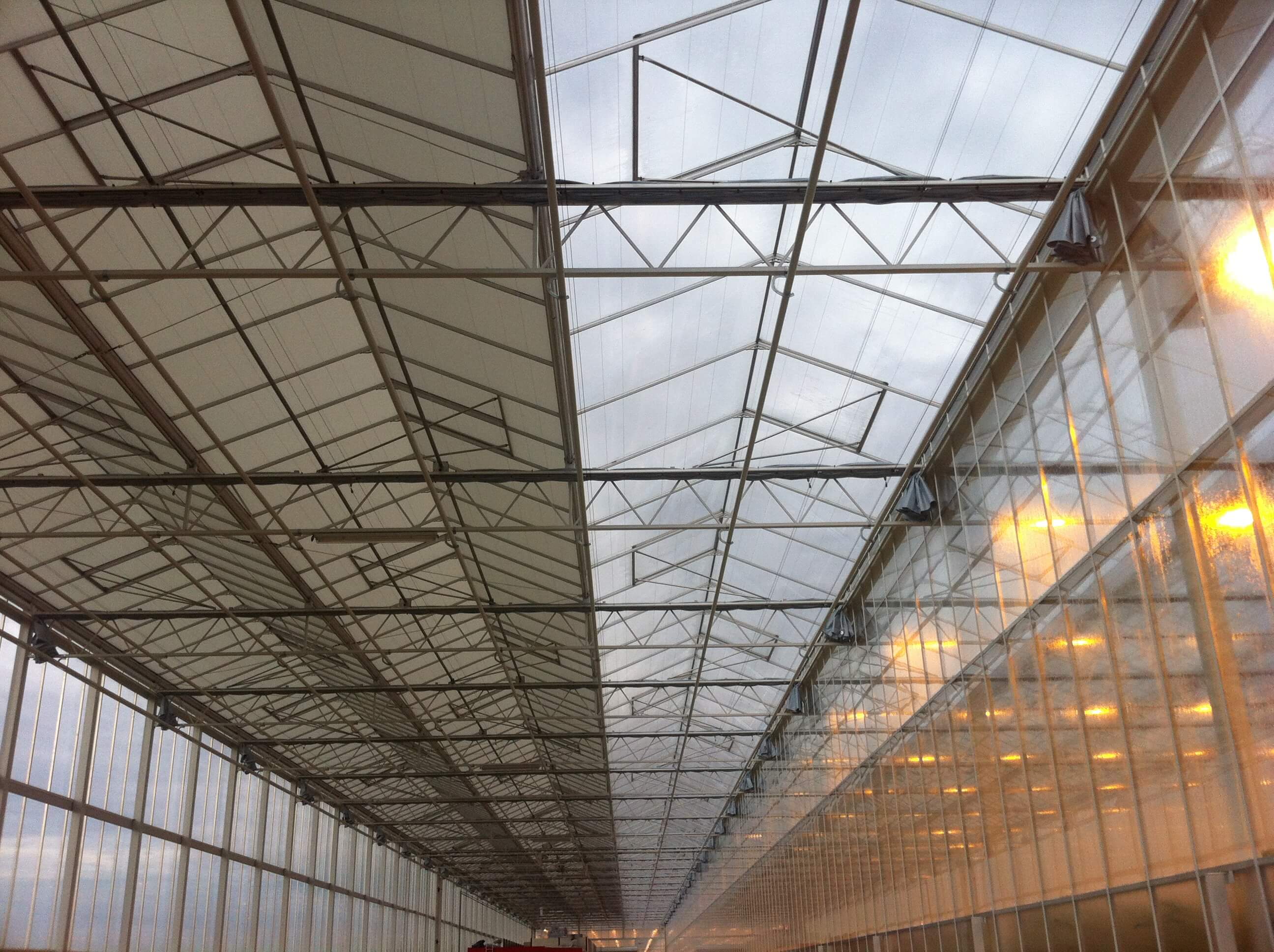 It is also possible to install screen systems above the greenhouse. There are several possible options. For a Venlo greenhouse, a horizontal structure is installed in the gutter or on the ridge to which the screen system is attached. For a wide-span greenhouse, a roof roll screen can be mounted on the roof, which is rolled down from the ridge to the gutter. The advantage of an external screen is that the warmth of the sun is deflected outside instead of inside the greenhouse.
